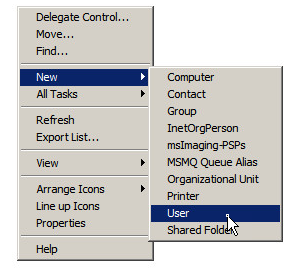 In the Server Manager, in the “Active Directory User and Computer” branch, create a new Organizational Unit with a meaningful name (“TeamDrive” for example). Select this newly created Organizational Unit and right click the middle panel to create a new user.